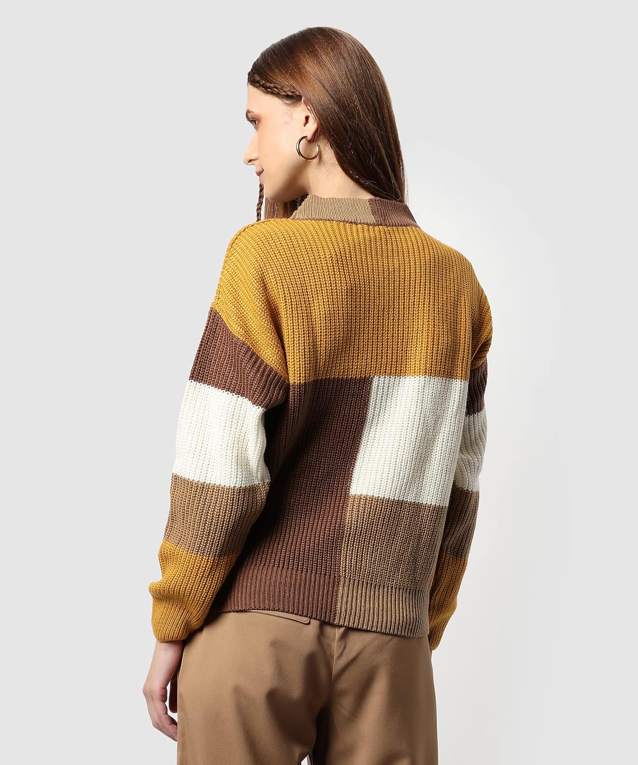 Campus Sutra Women & Girls Cotton Striped Regular Fit Sweater for Winter Wear | Polo Neck | Full Sleeve | Woolen Sweater | Casual Jacket| Western Stylish Jacket