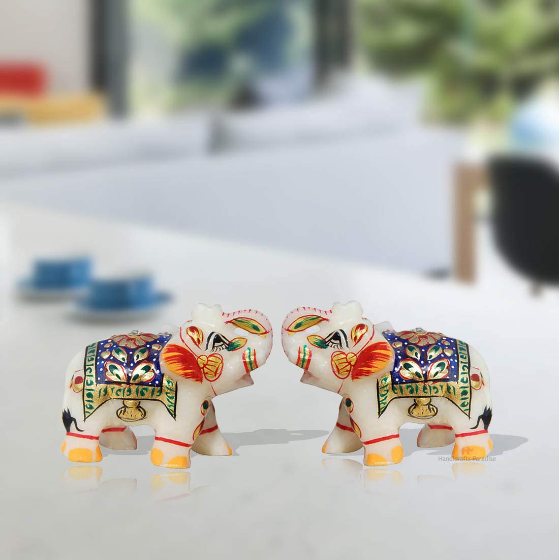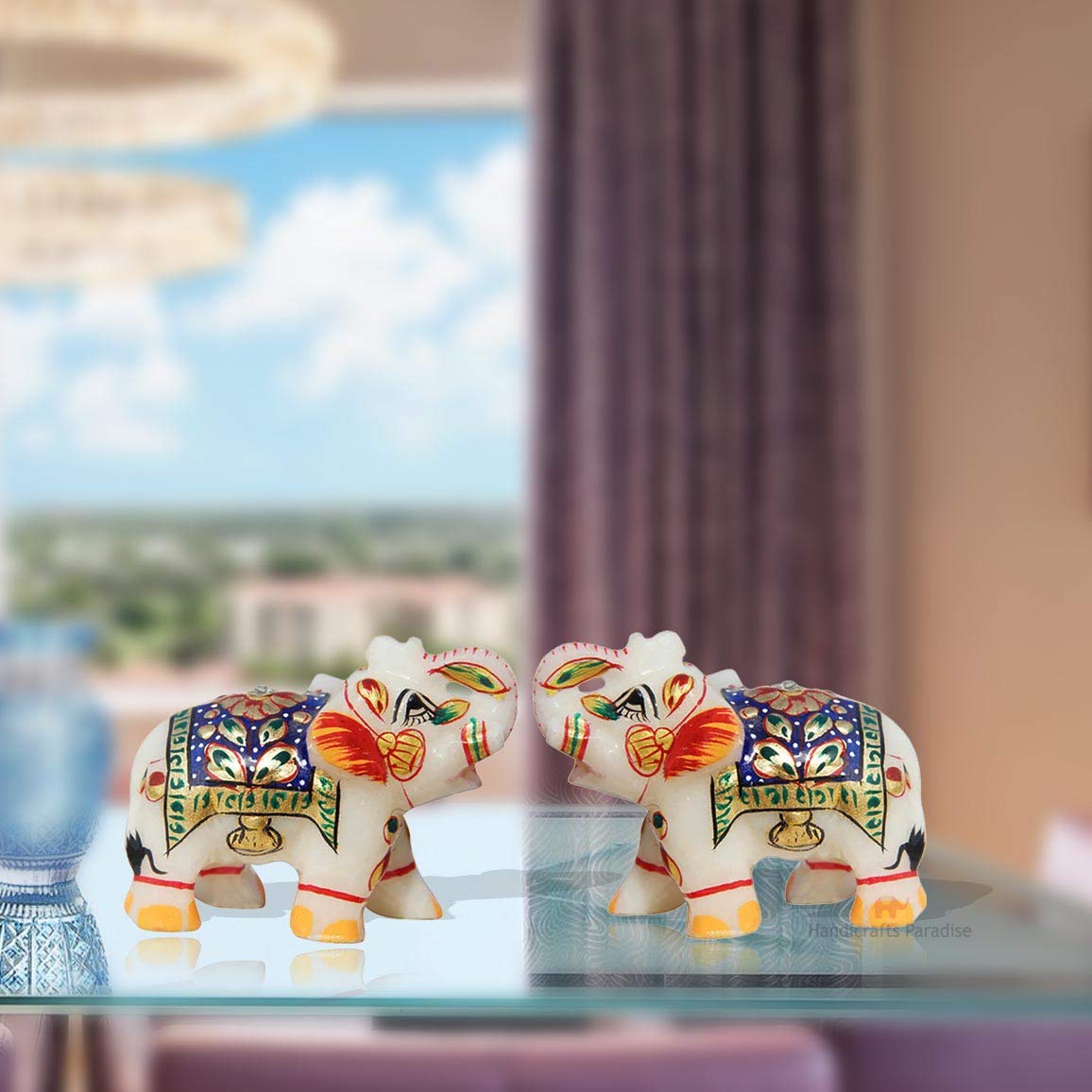 This pair of marble elephant by handicrafts paradise is master craftsmanship with fine and beautiful work, this pure white rajastani marble royal elephant pair with beautiful hand painting on their back and trunk is an epitome of skilful craftsmanship. The sculpture features the royal elephants in all their glory and greatness. The sculptures will make a beautiful addition to your home decor.