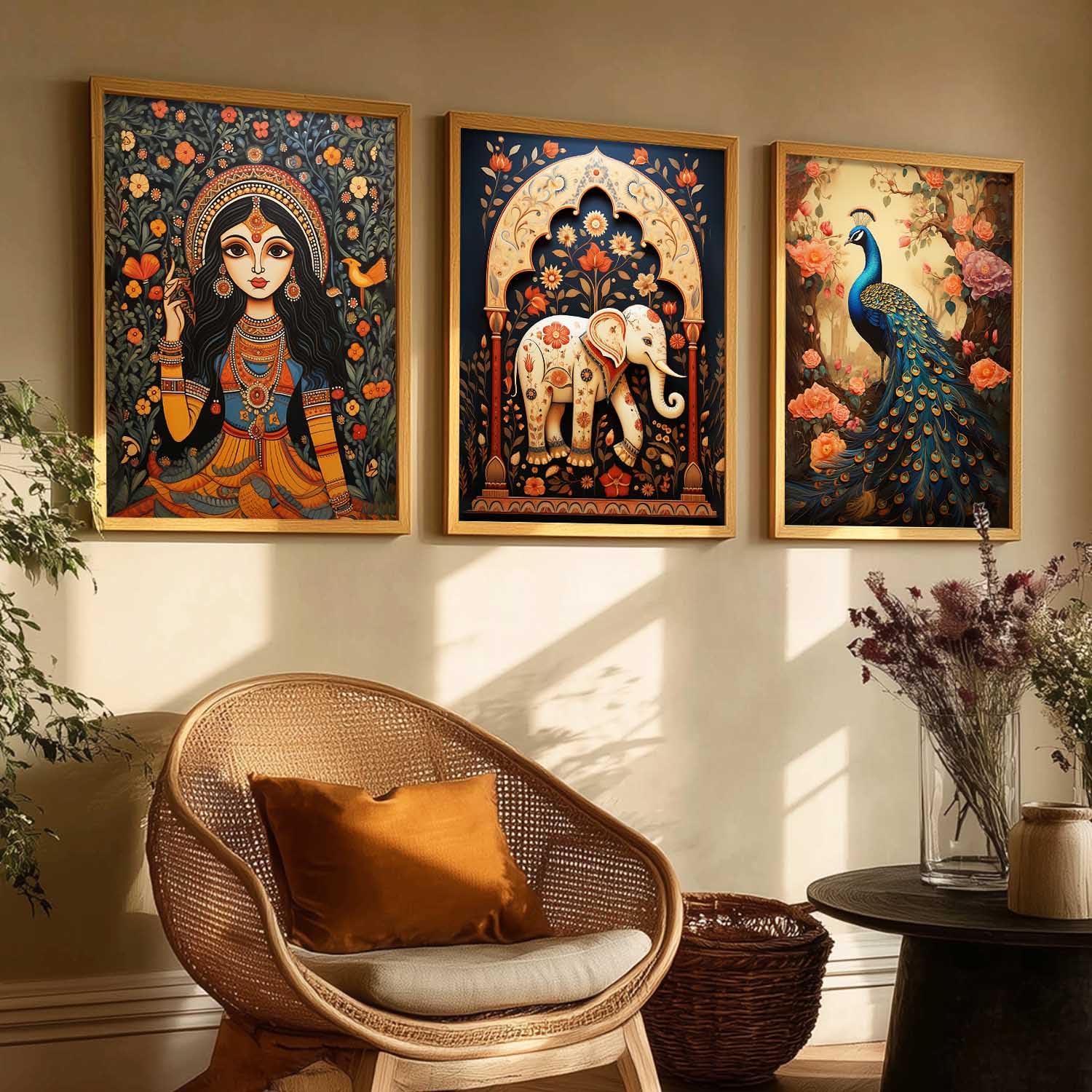 kotart Traditional Wall Art Painting With Frame | Madhubani Vastu Peacock Paintings Home Decoration For Living Room Bed Room Hotel Wall Decor Digital Reprint Set of 3 (13X17 inch)