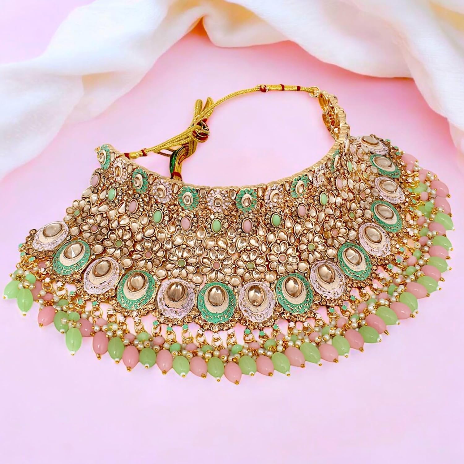 Live the complete charm of your wedding or traditional outfits with this complete bridal set studded with shiny CZ; colored stones and designed exquisitely in drop design. A pair of matching earrings; one maatha patti; pair of hathphool; one choker necklace and one long necklace completes the typical Indian bridal look!