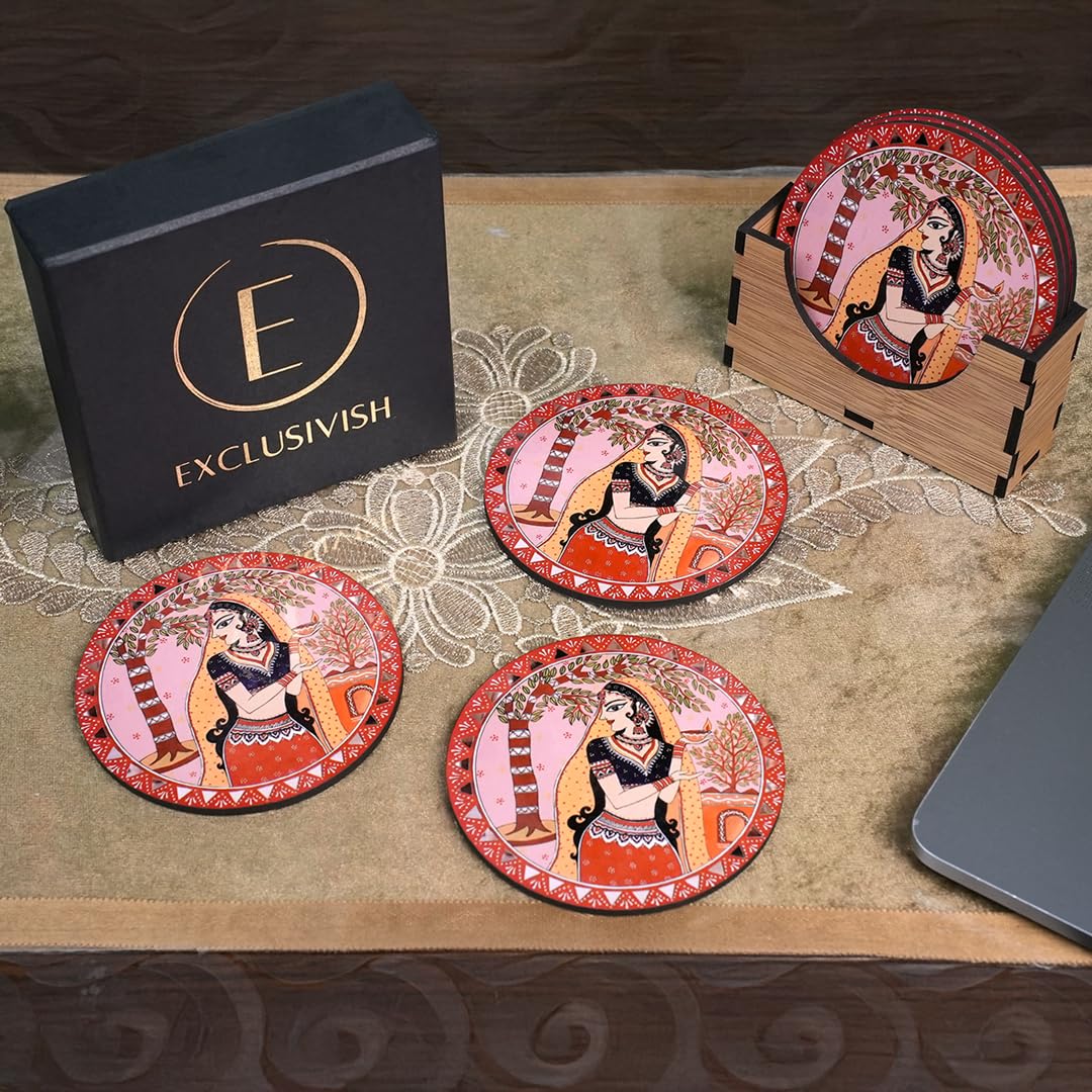 Each coaster showcases vibrant depictions of folk women in traditional attire, surrounded by intricate floral and geometric motifs that symbolize prosperity, grace, and harmony. The artistry reflects the authentic Madhubani painting style, hand-inspired and rich in cultural meaning. This set includes a custom wooden holder for tidy storage and an elegant box, ensuring they are both functional for daily use and ready for gifting on any occasion.