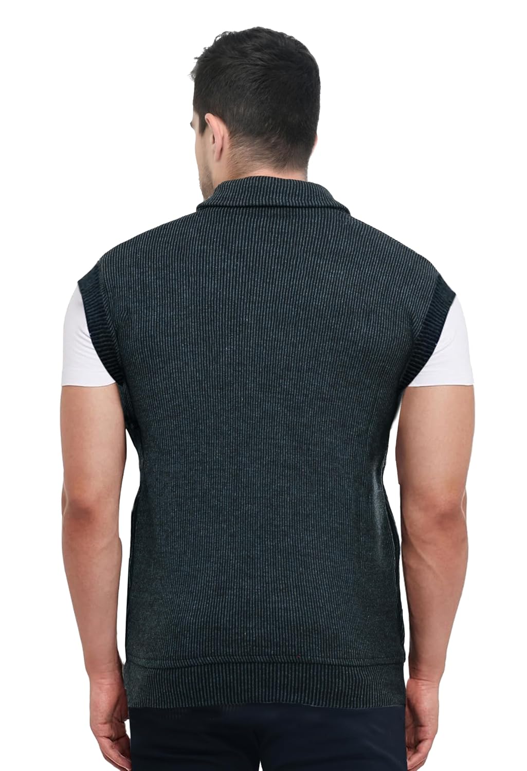 Stay warm and stylish this winter with this sleeveless woollen jacket that combines functionality with fashion. The thick fabric construction provides excellent insulation whilst maintaining a sleek silhouette. Features include a practical high collar design that shields your neck from chilly winds, a reliable zipper closure for easy wearing, and convenient side pockets to keep your essentials close. The sleeveless design allows for versatile layering options – wear it over full-sleeve shirts, t-shirts, or even other sweaters for added warmth. Perfect for casual outings or daily wear during cold weather, this winter essential offers unrestricted arm movement while keeping your core warm. The classic design makes it a versatile addition to any wardrobe, easily pairing with both casual and semi-formal attire.