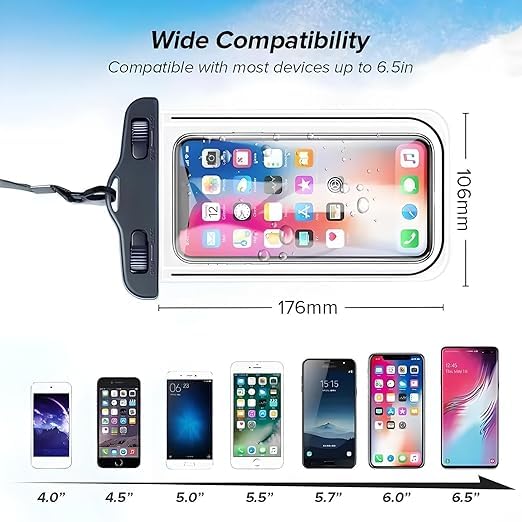 Universal size waterproof case dry bag, fits all smartphones up to 6.7 inches and 4 inches wide; Also can be protection for your ID, cash, credit cards, passport, keys.