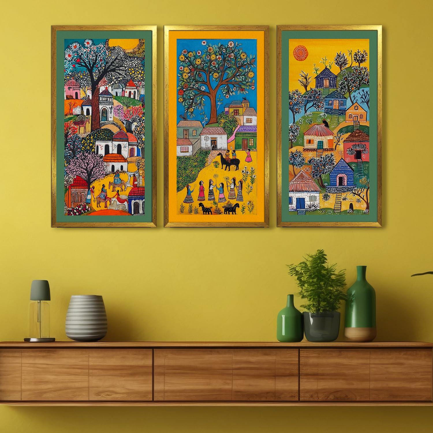 PAPER PLANE DESIGN Madhubani paintings for living room. Set of 3 canvas wrapped framed madhubani art for wall decor. 12 x 24 inch x 3 frames. (I)