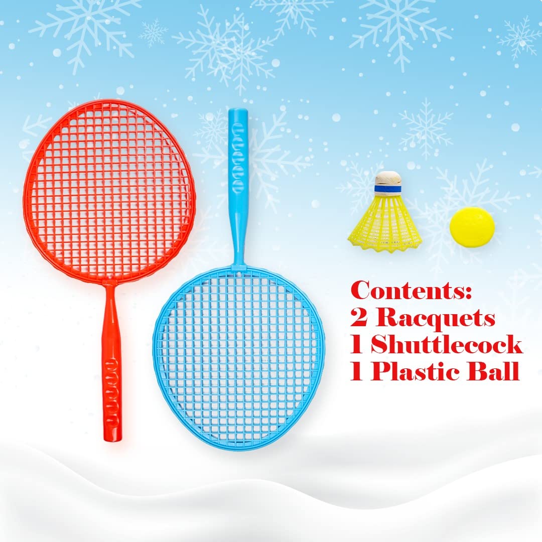 CONTENTS: 2 BADMINTON RACQUETS, 1 PLASTIC SHUTTLECOCK & 1 PLASTIC BALL