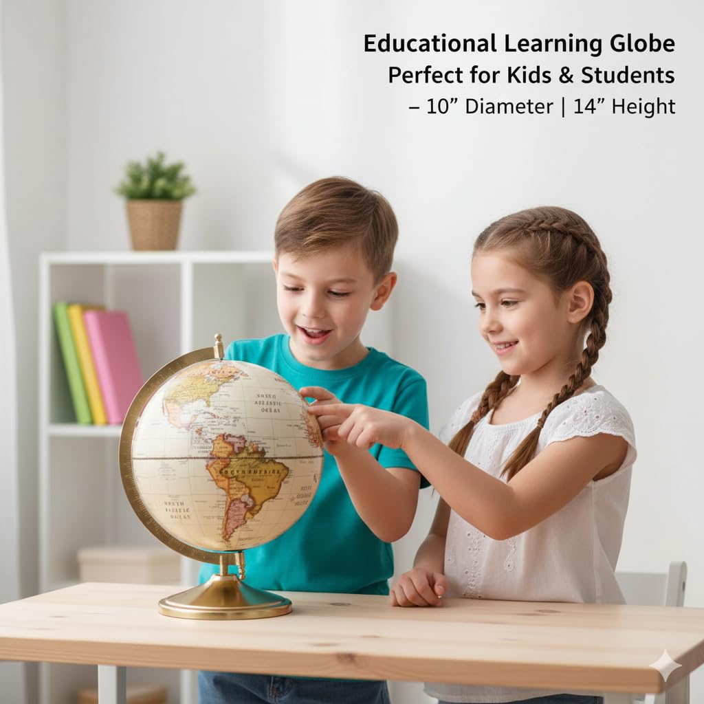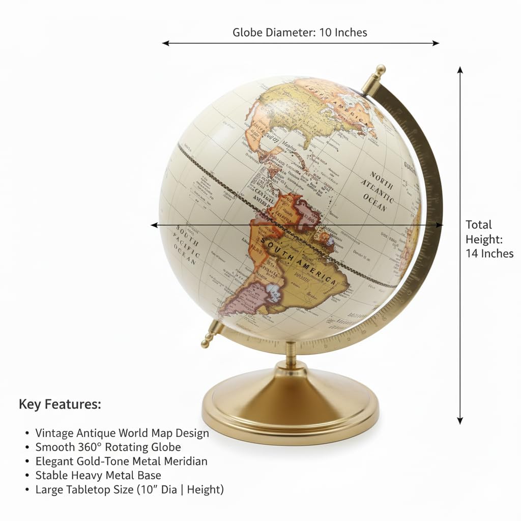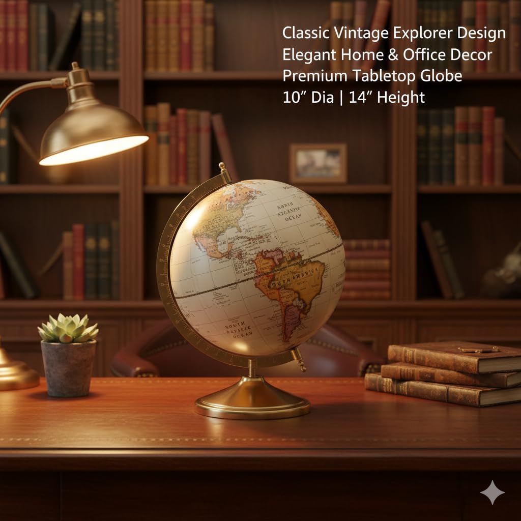 Premium Vintage Design Elegant antique-style world globe with classic map detailing and a polished brass stand, perfect for adding a sophisticated touch to any desk or shelf.