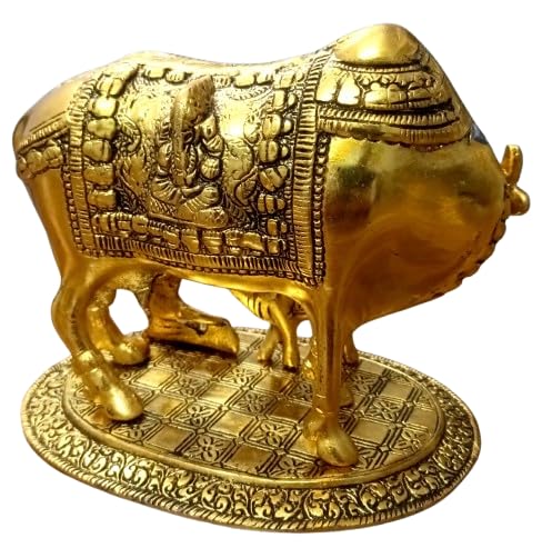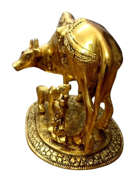A beautifully crafted gold-toned metal statue depicting the sacred *Kamadhenu* cow along with a symbolic divine scene. The central figure is Kamadhenu, the sacred -fulfilling cow in Hindu mythology, richly adorned with intricate carvings. The cow’s features detailed embossing, including a depiction of a **deity (likely Goddess Lakshmi) on the decorative cloth draped over its back.small calf is shown drinking milk from the cow, symbolizing nourishment, purity, and maternal . Beside the calf sits a small **child Krishna figure, displayed in a playful posture—one hand resting on the ground and the other touching his face. The background is a wooden surface, which highlights the shine and details of the sculptureThis statue represents **prosperity, divinity, protection, and abundance**, making it ideal for home décor, temples, gifting, or spiritual spaces