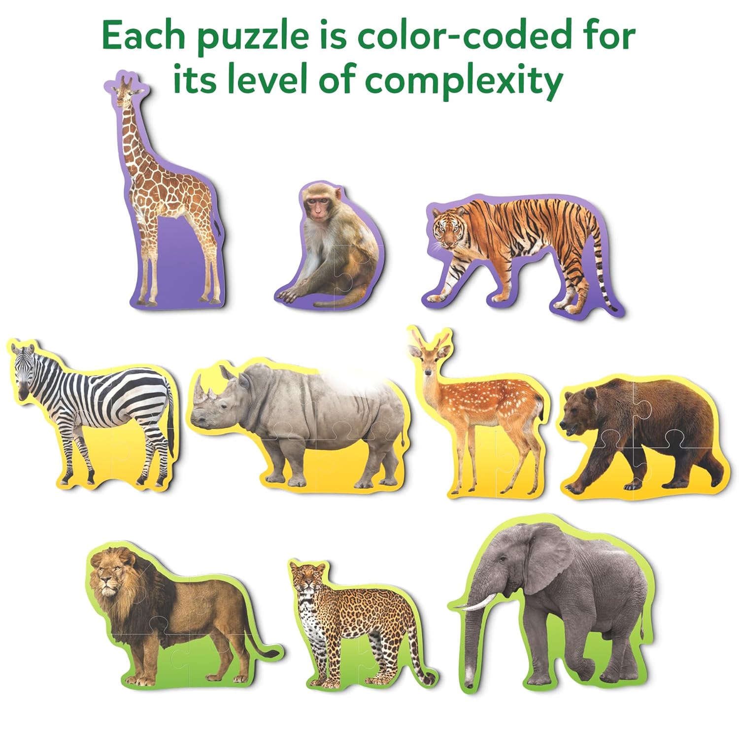 10 COLOUR-CODED PUZZLES: This set includes 10 colour-coded wild animal puzzles that progress in complexity. Start with the 3-piece puzzles and progressively work up to 4-piece and finally the 5-piece puzzles. Each type of puzzle is colour-coded so it’s easy to sort. As young children master their puzzling skills, they’ll learn about wild animals and build confidence along the way.