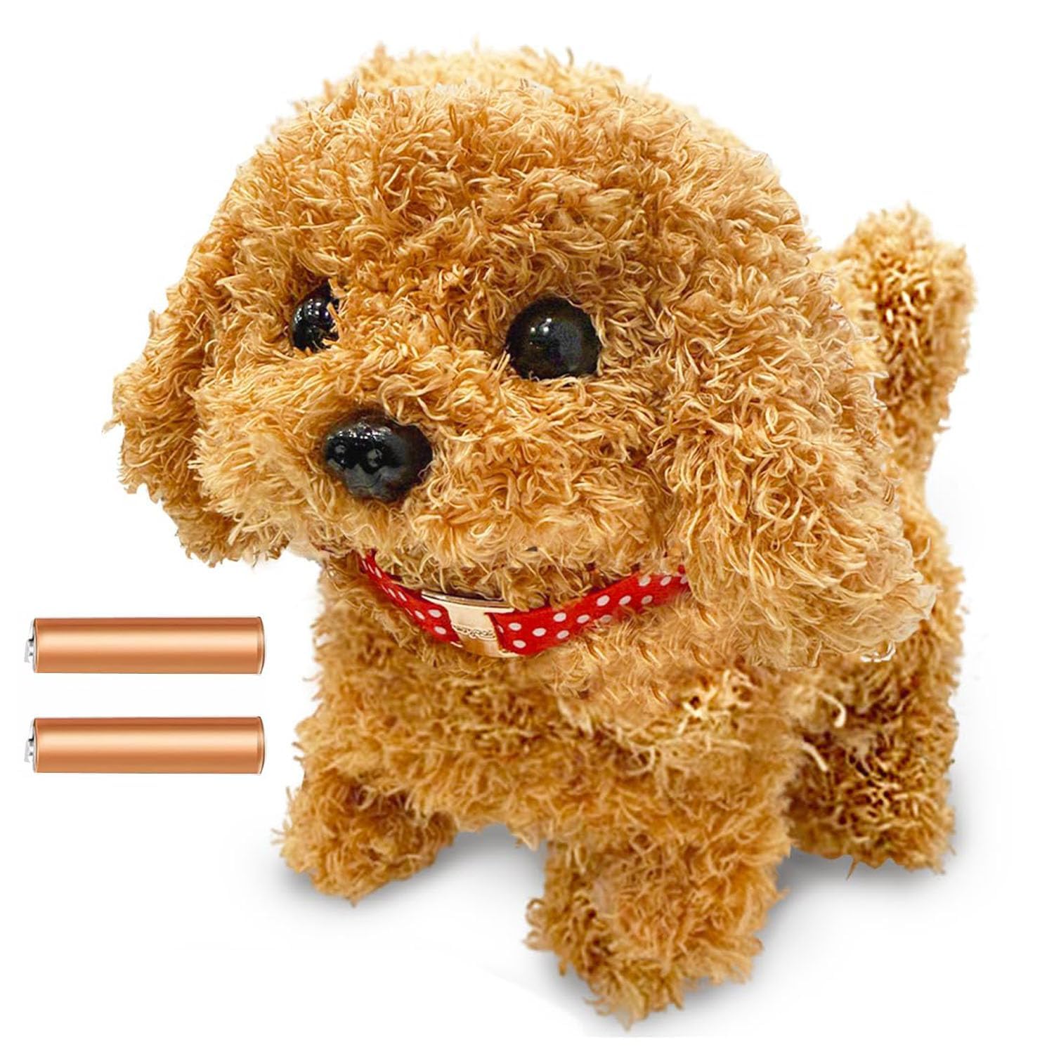 Soft plush puppy with vivid appearance, compact size (6.1 in), easy on/off switch, and powered by 2 AA batteries—perfect for kids’ playtime and gifting.