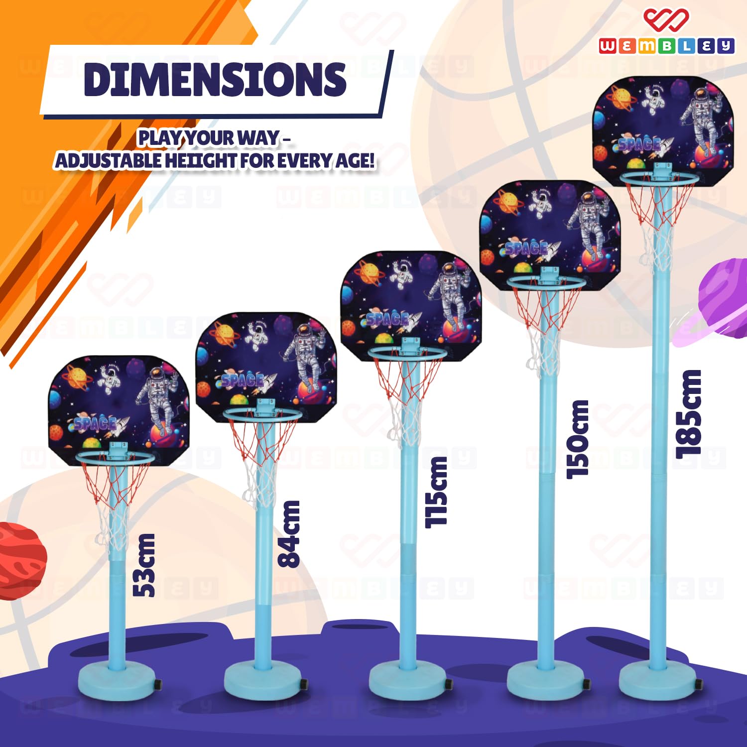 Fun Play for All Ages: Wembley’s indoor basketball set brings easy, energetic fun to kids of every age. Built with a sturdy base and a smooth height-adjustable pole, it shifts effortlessly from 53 cm to 185 cm, making it perfect for little beginners and growing players alike. Its playful design keeps kids engaged, encourages active movement, and turns any room or outdoor spot into a lively game zone.